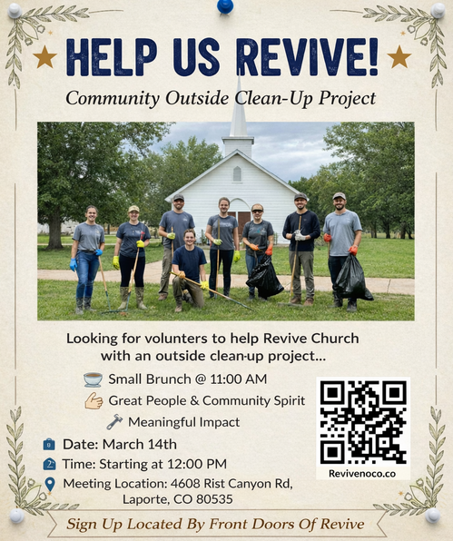 Welcome to Revive! We are a small church only an 1/4 mile west of Vern's Place in Laporte, Colorado. We started meeting publicly as a church in 2020 when the world was in panic mode due to Covid 19. For the first several months of our existence, we met in the parking lot and online. Then, after enduring wind, snow, and rain, we moved into our remodeled building. We've been inside ever since then and the Lord is blessing us at Revive!